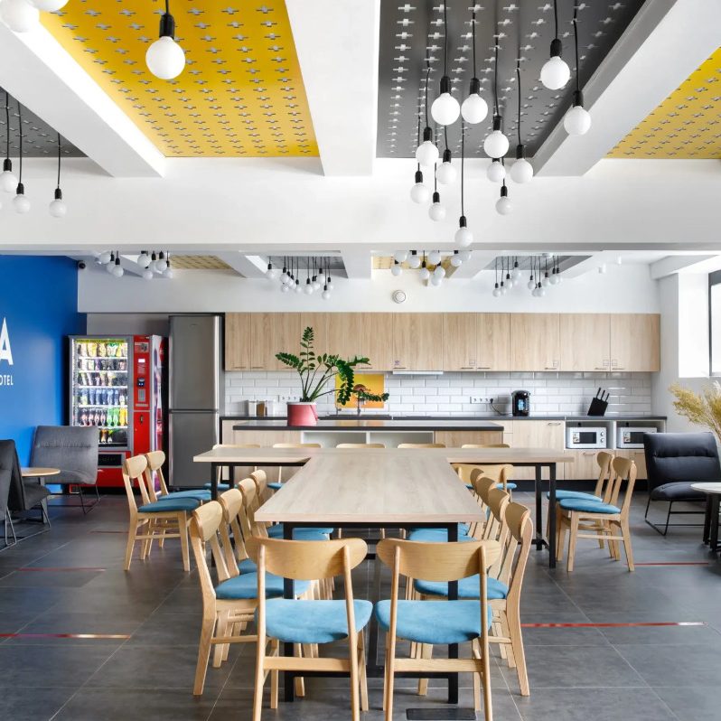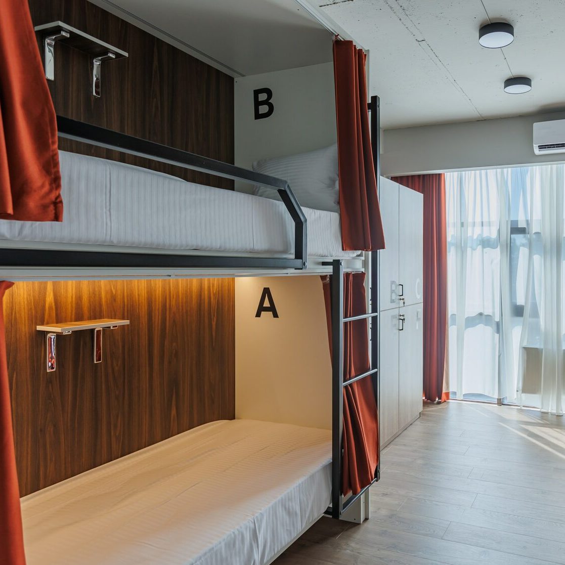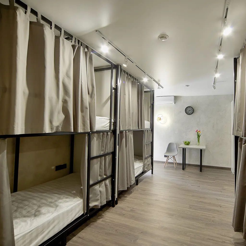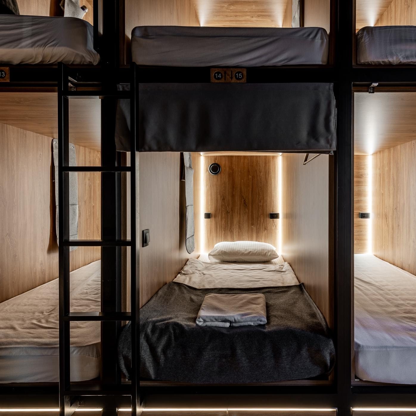Этот капсульный хостел мы когда-то проинспектировали лично, поэтому включили его в список, опираясь на собственный опыт. Здесь довольно просторные капсулы в общем номере, но есть и мини-комнаты для одного-двух постояльцев. Очень приятная и просторная лаунж-зона с оборудованной кухней, а ещё потрясный вид на Площадь Восстания — завтракать здесь одно удовольствие!