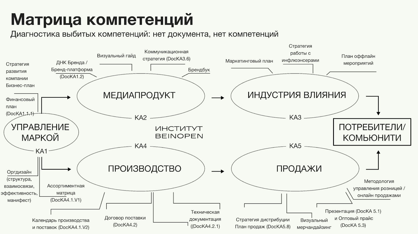 Что значит «отлаженный бизнес» и «сложная система»? В успешных брендах, командах и у основателей есть определённый набор компетенций. На их основе мы разработали матрицу компетенций — инструмент, который позволяет определить, каких именно элементов не хватает вашему бренду для роста. Например, навыков в области производства, дистрибуции или коммуникации. Посмотрим, как это работает.