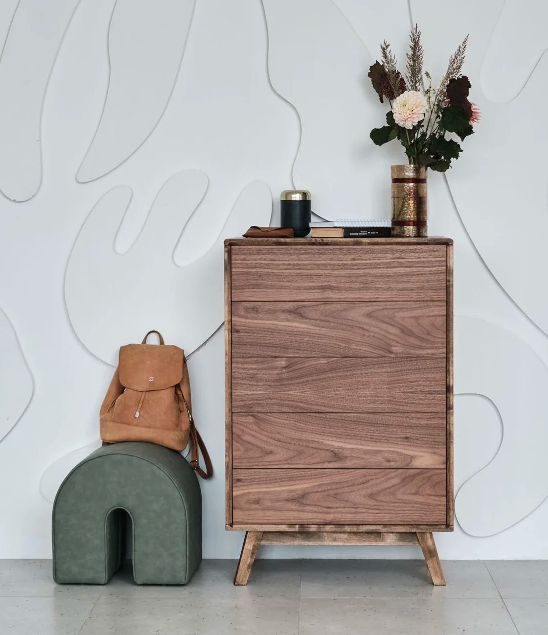 Глядя на эту мебель, кажется, что дизайнеры вдохновлялись стилем прошлых эпох: есть во всём-этом что-то от 60-х и 70-х — плавные линии, ножки, эргономичность… Идеальный вариант для тех, кто любит интерьеры вне времени. Почти все изделия тут кастомизируют, так что клиент может выбрать не просто комод или шкаф, но и его цвет, размер и фактуру.