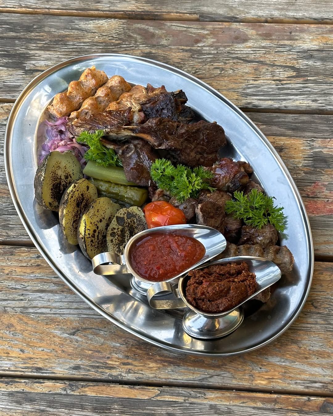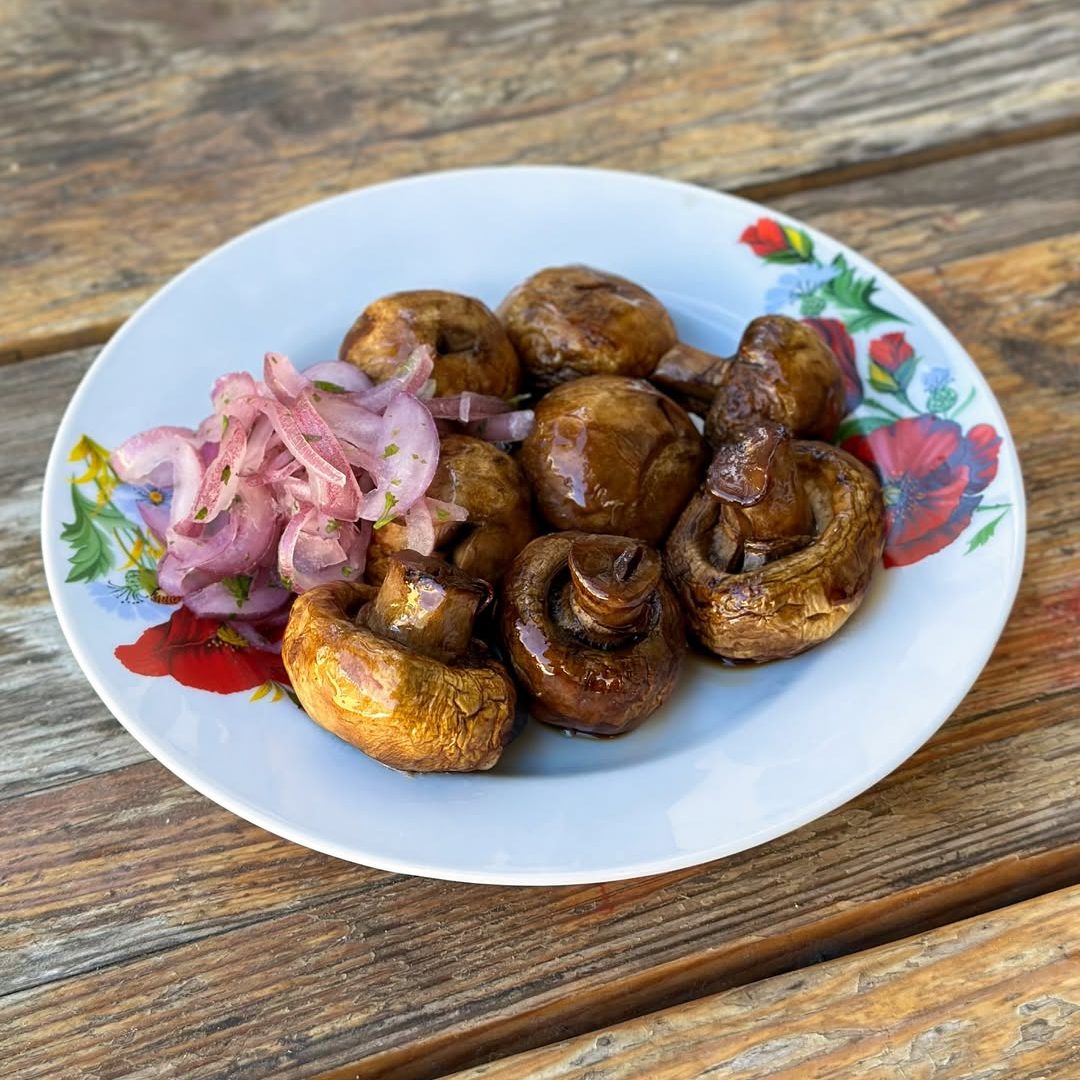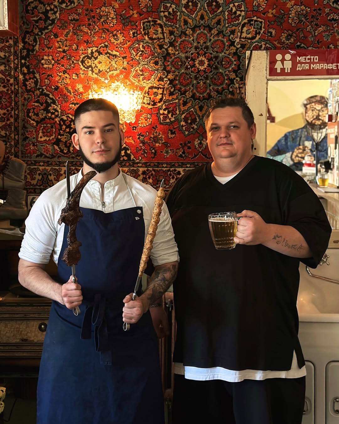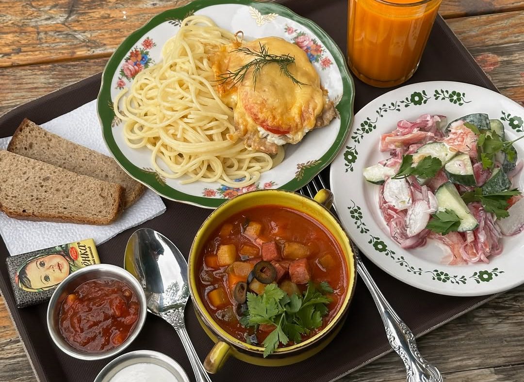 В основе меню же, как можно догадаться — блюда на мангале из мяса, птицы и рыбы, а также закуски в советском стиле вроде бутербродов со шпротами.