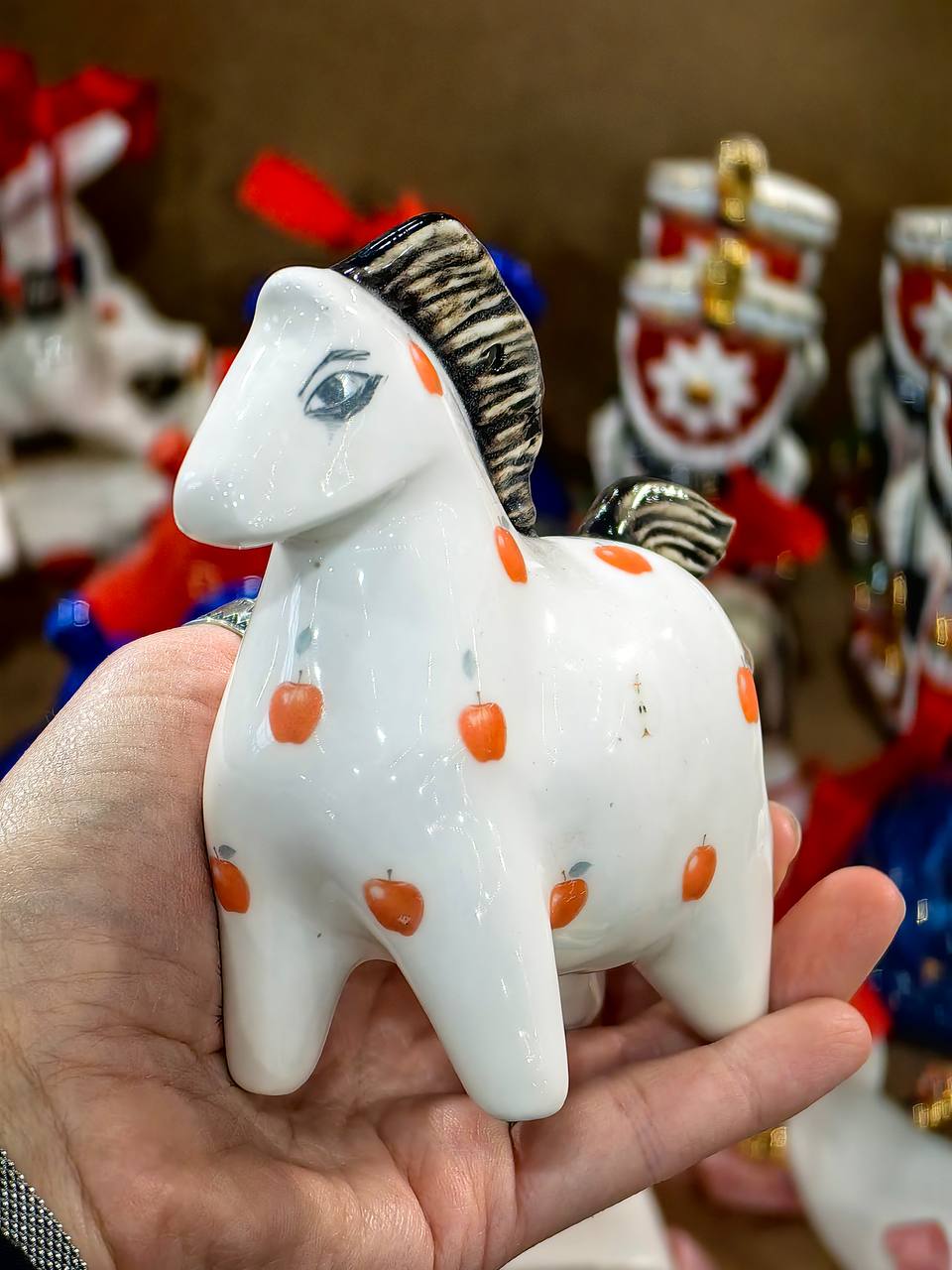 Таких лошадок от бренда «Красно» можно поставить на полку, а можно повесить на ёлку — качалки есть разных расцветок и форм, но все они символизируют наступающий год. Нам особенно запали в сердце однотонные «толстенькие» коники — очень стильно! Вообще, в мастерской чего только ни делают, есть даже фарфоровые куски тортов, которые не просто красивые, но и функциональные — туда можно ставить свечки.