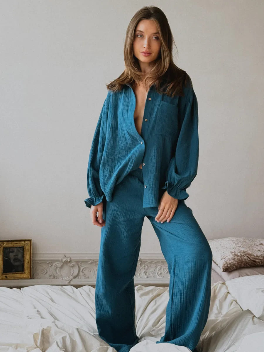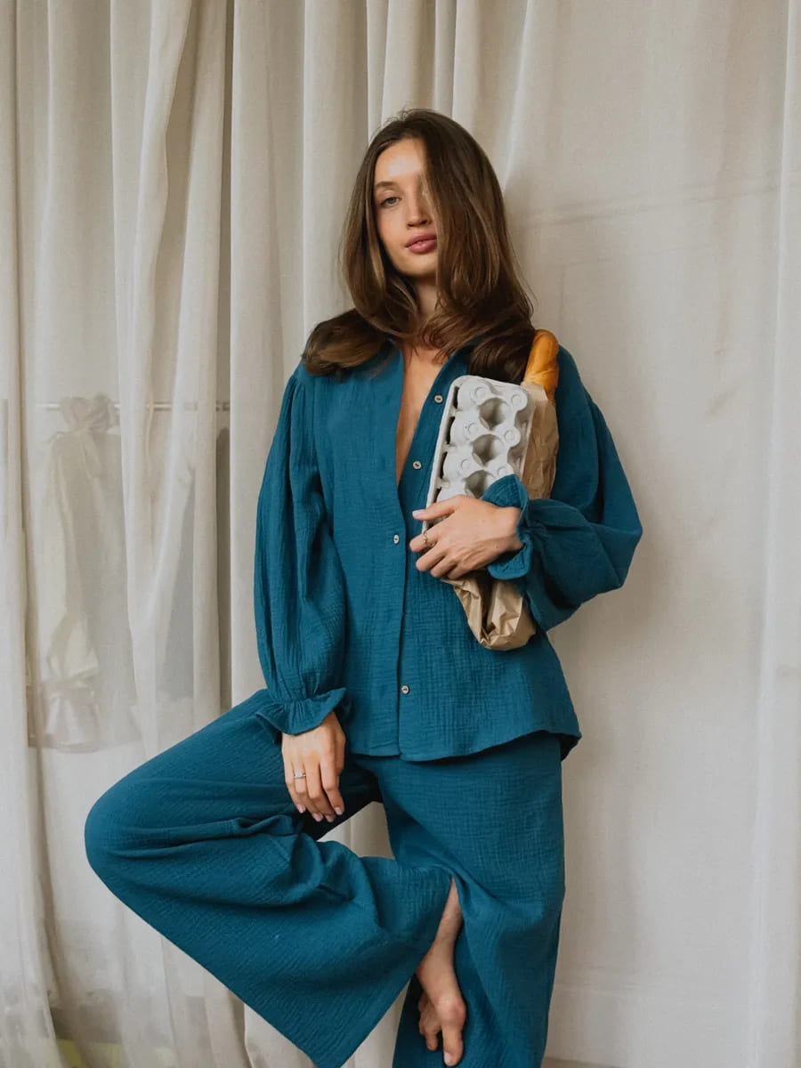 Муслин — натуральная, тонкая и очень мягкая ткань, так что не удивительно, что костюмы и пижамы из неё любят многие. А у этого домашнего костюма ещё и прекрасный глубокий цвет и хорошие отзывы на Wildberries.
