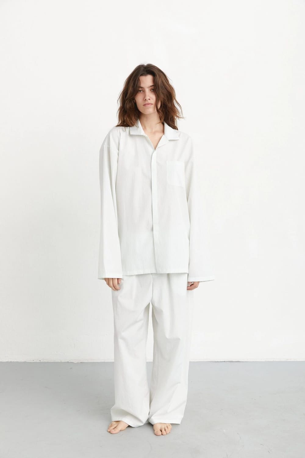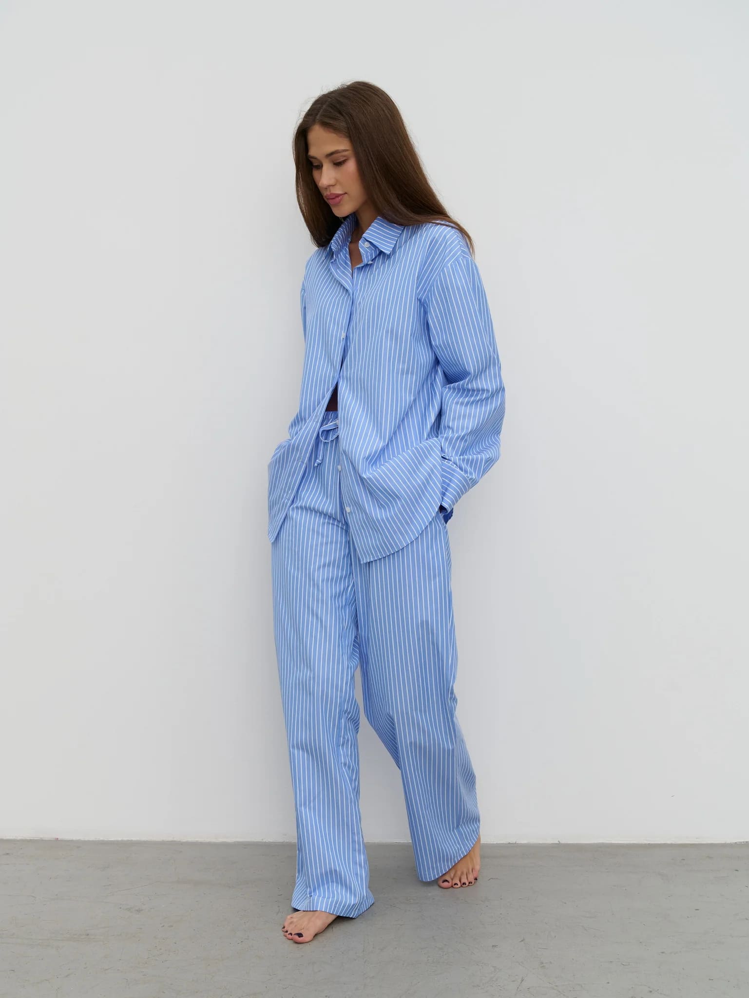 Бренд, который приглянулся нам своими съёмками, специализируется на одежде для дома и пижамах. Правда, именно пижамы у калужской марки преимущественно классические: рубашка и брюки. Есть варианты с контрастным кантом и «Kak v kino» (это название модели) — в тонкую полоску. Она нам и приглянулась. Кстати, мужские пижамы тут тоже есть, но только в одном фасоне.