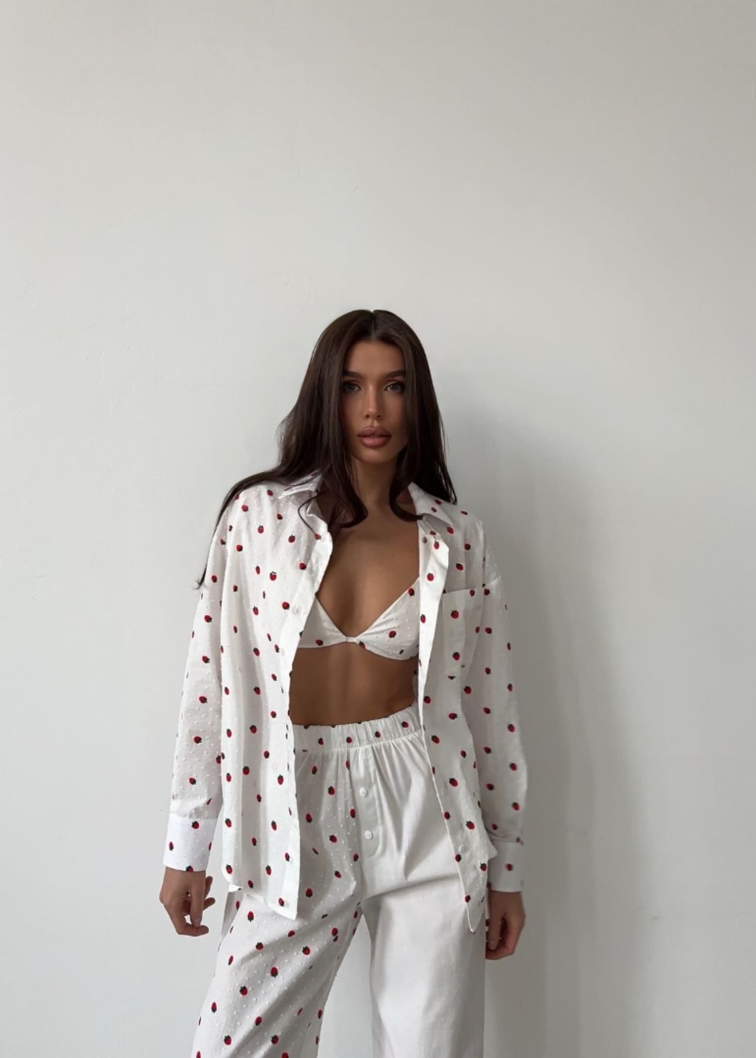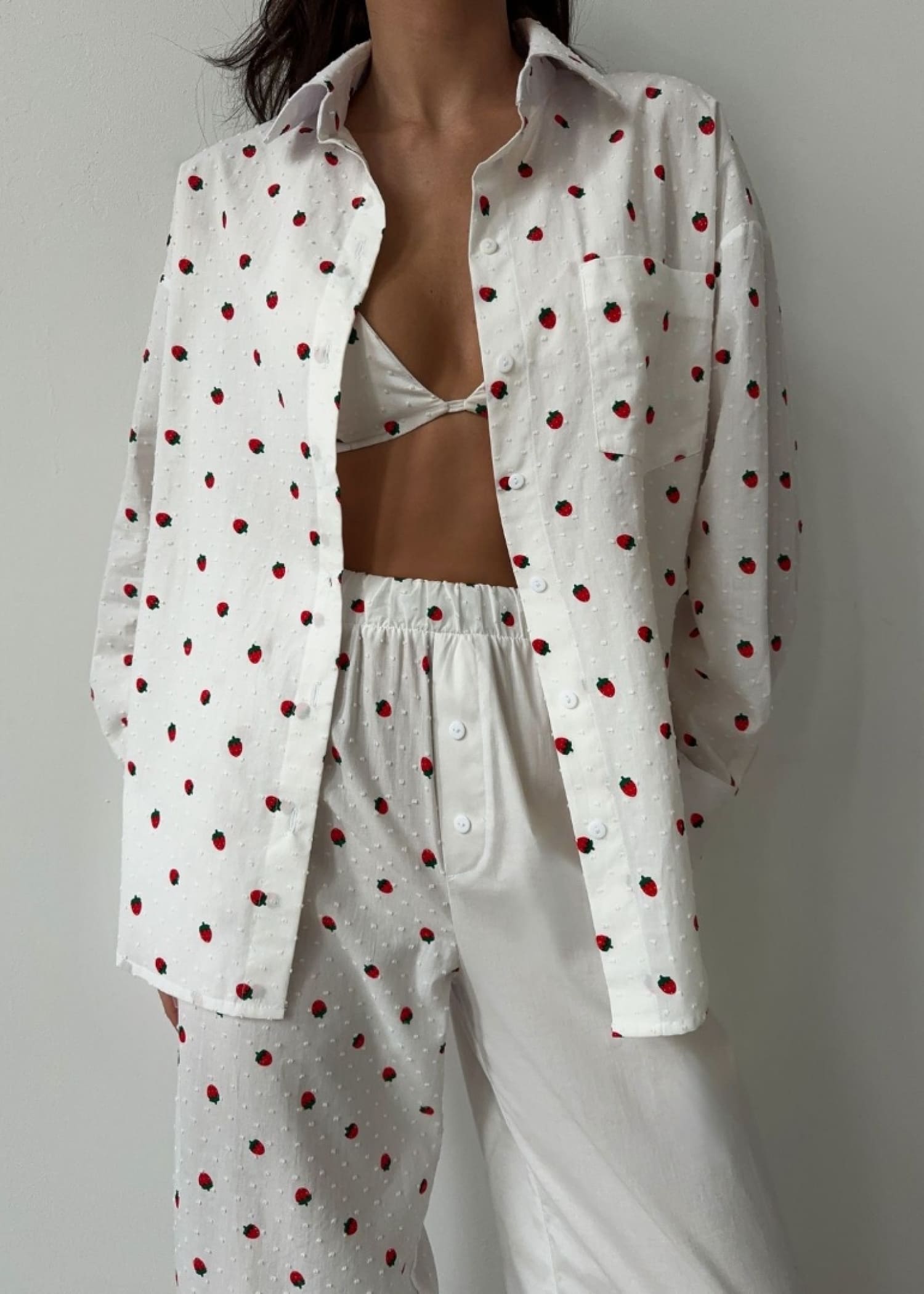 «Не пижама, а искусство делать вид, что ты не проигрываешь жизни, просто наблюдаешь за ее абсурдом в хлопке премиального качества», — так описывает комплект сам бренд. Милый принт, текстура «с пупырками» и асимметричные штаны с непринтованной штаниной — в комплекте прекрасно всё, кроме того, что собирать его на сайте нужно по отдельности, а в наличии бывают не все его составляющие.