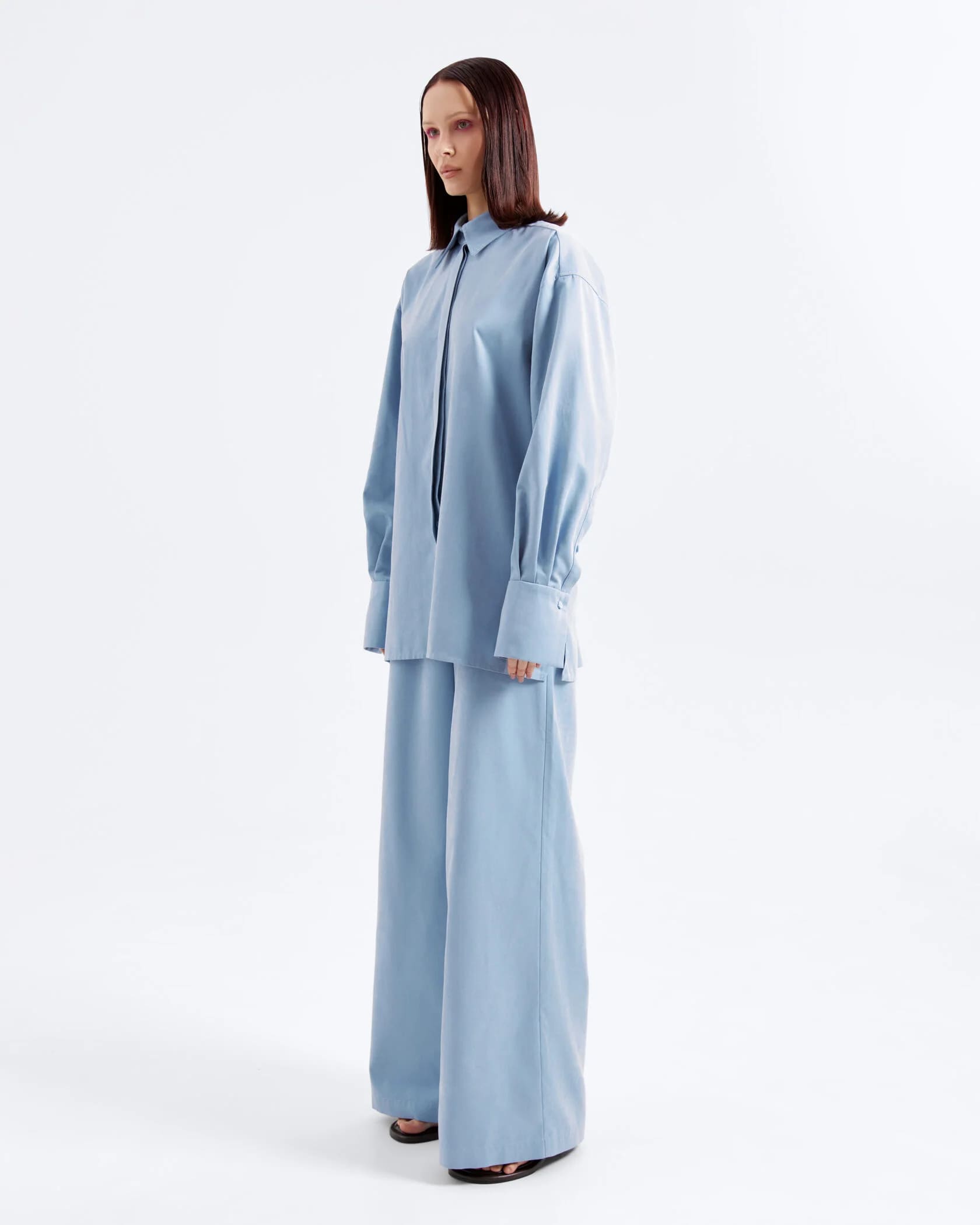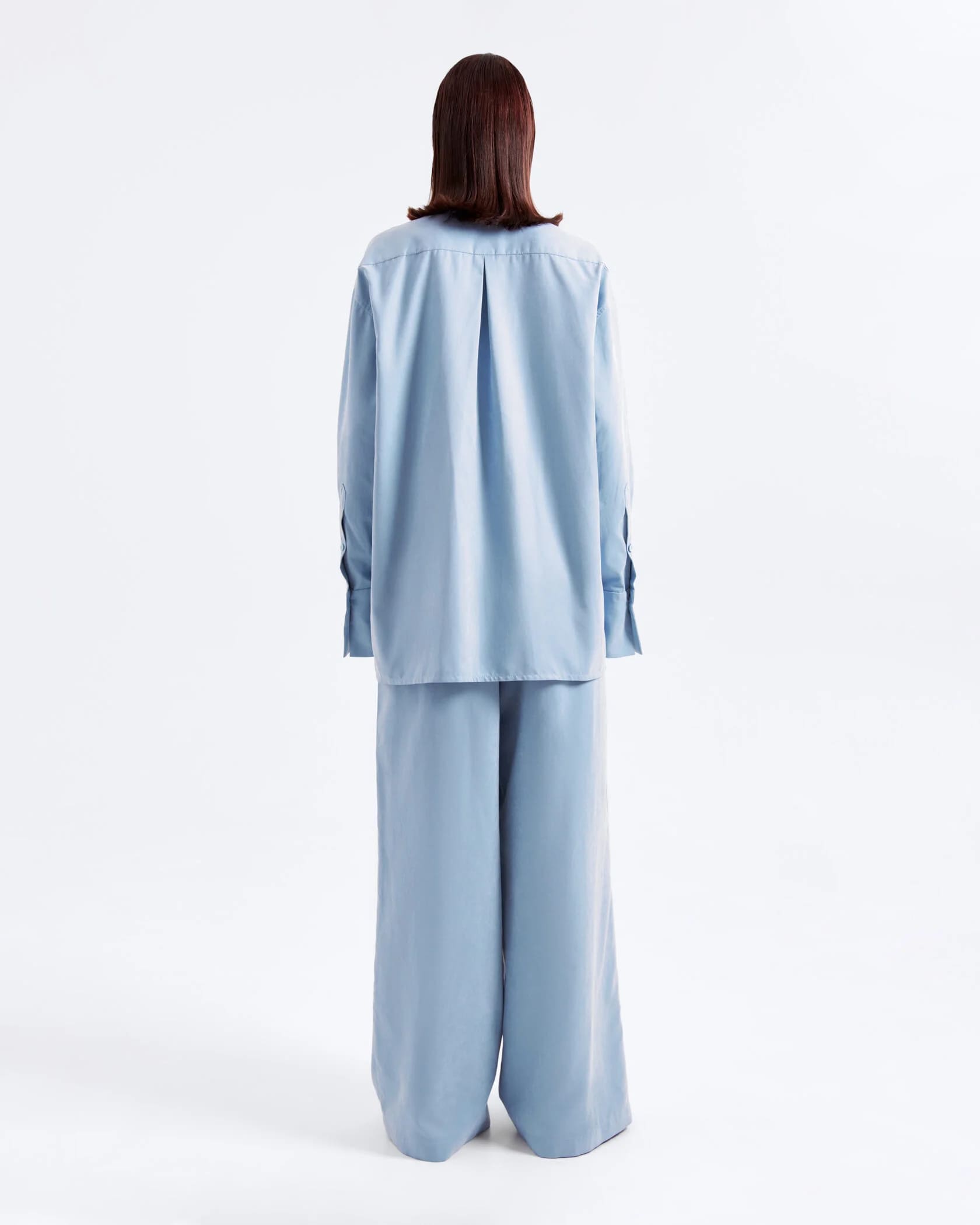 Классическая пижама свободного кроя в приятном голубом цвете с лёгким атласным блеском — что ещё нужно? Уж в таком-то комплекте точно не стыдно из дома выйти. А если рубашку надеть с другим низом, например, джинсами или костюмными брюками, кажется, никто в жизни не догадается, что это пижама!