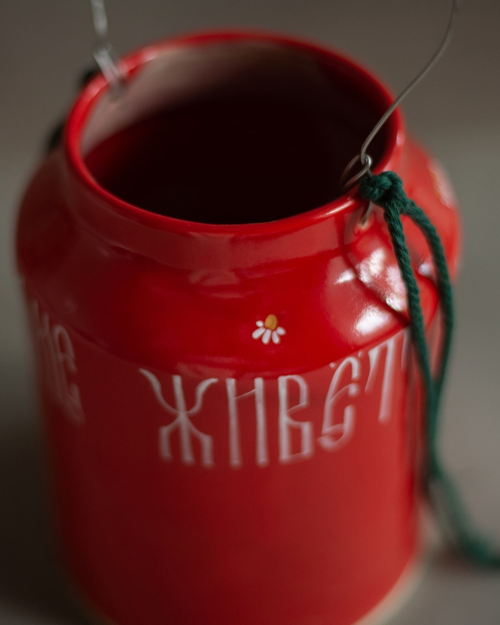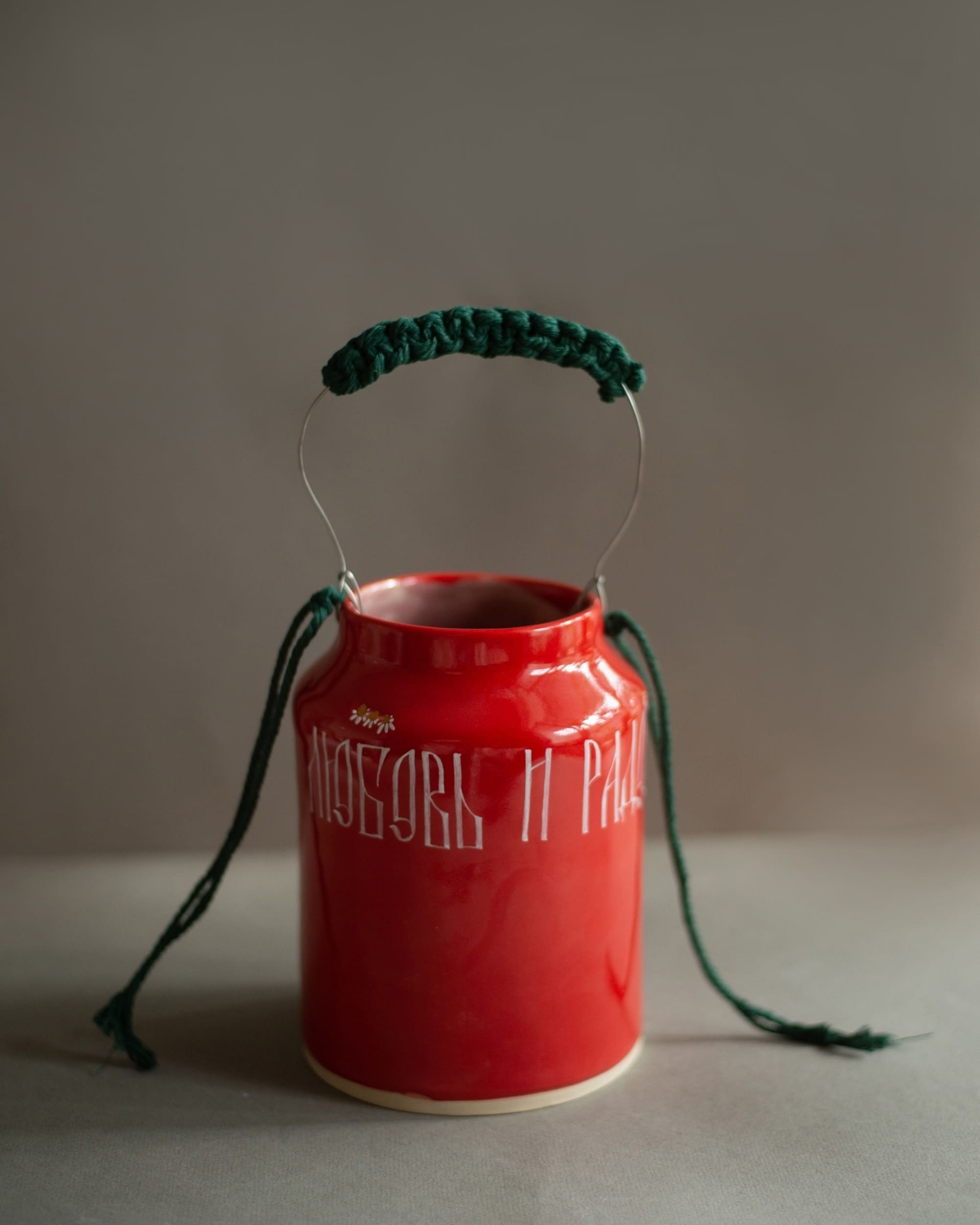 Создательница мастерской Мария Агафонова украшает свои керамические изделия добрыми пожеланиями, выполненными в стиле русской вязи. В своих работах художница вдохновляется христианской символикой и предметами, связанными с приятными воспоминаниями. Этот бидончик — самая настоящая ностальгическая вещь, своеобразная копилка тёплых чувств.