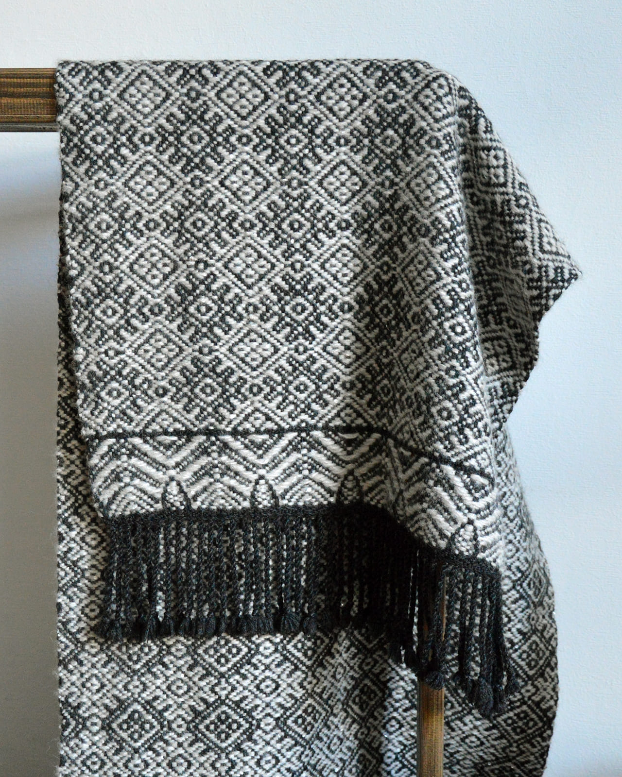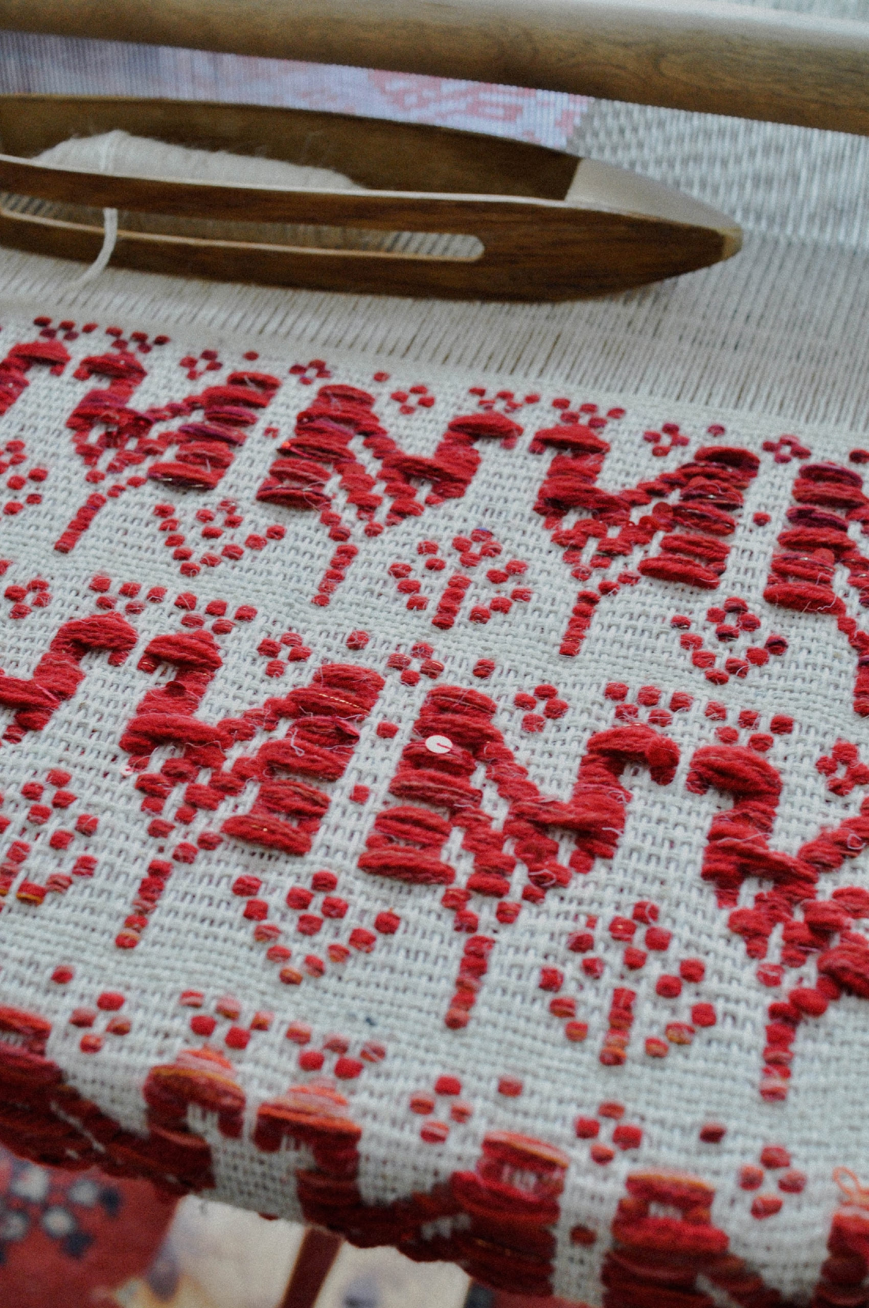 Текстиль Марии Шпаковой создаётся на ручном ткацком станке. В своих работах мастерица обращается к культурному наследию региона, переосмысляя народные узоры и вышивки и адаптируя их для ткачества. Палантин со старинным смоленским узором можно использовать не только как элемент одежды, но и вписать в интерьер в качестве небольшого покрывала на кровать или диван.