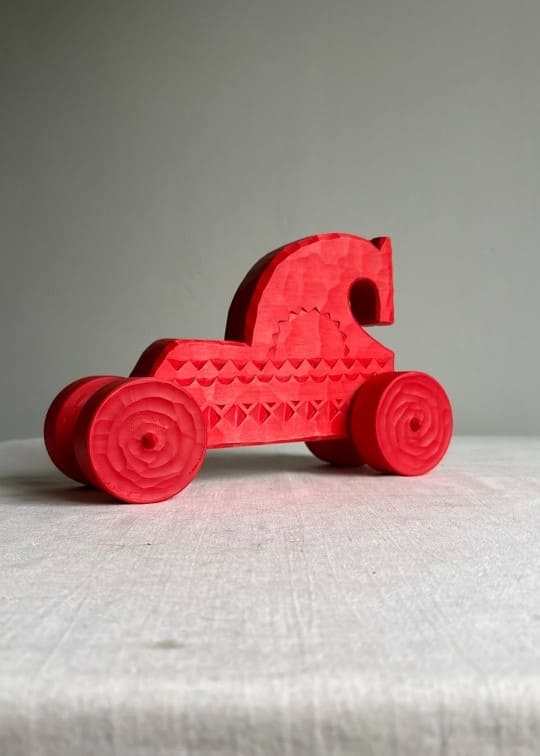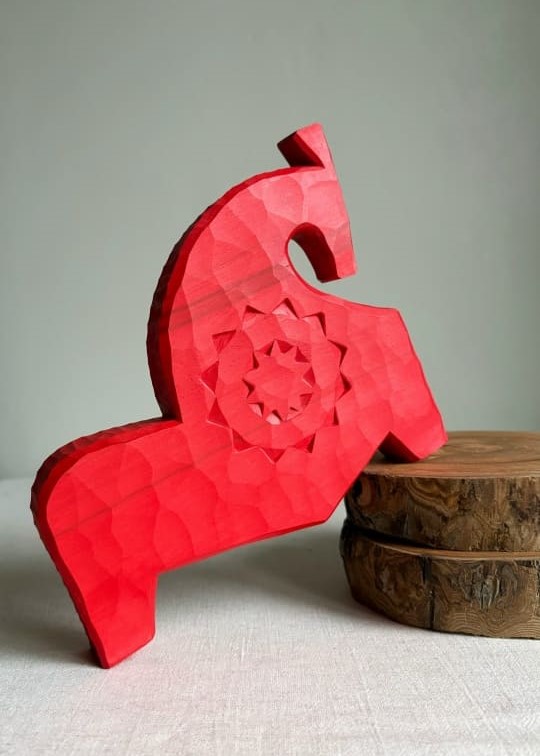 В Липецкой области, где вырос художник, резчик по дереву и этнограф Алексей Блинов, бахарями называли сказочников и фантазёров. В детстве Алексею дали такое прозвище, оно же и стало названием мастерской. Работая в традиционной технике трёхгранной резьбы, художник создаёт деревянные интерьерные объекты, отсылающие к быту, мифу и народным сказкам. Один из ярких, в прямом смысле, примеров — этот красный конь.