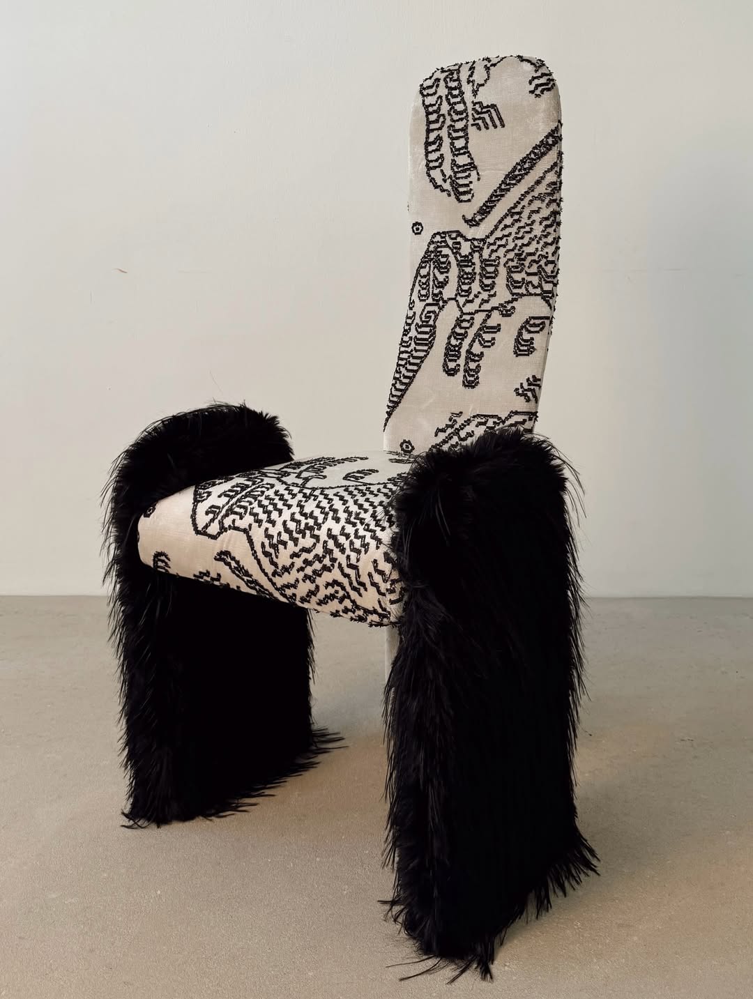 Бренд охотится за редкими экземплярами прошлых лет, переосмысляя их во время реставрации. Так, итальянский винтажный стул из 80-х превращается в арт-объект благодаря необычному решению — ножкам из искусственного меха.