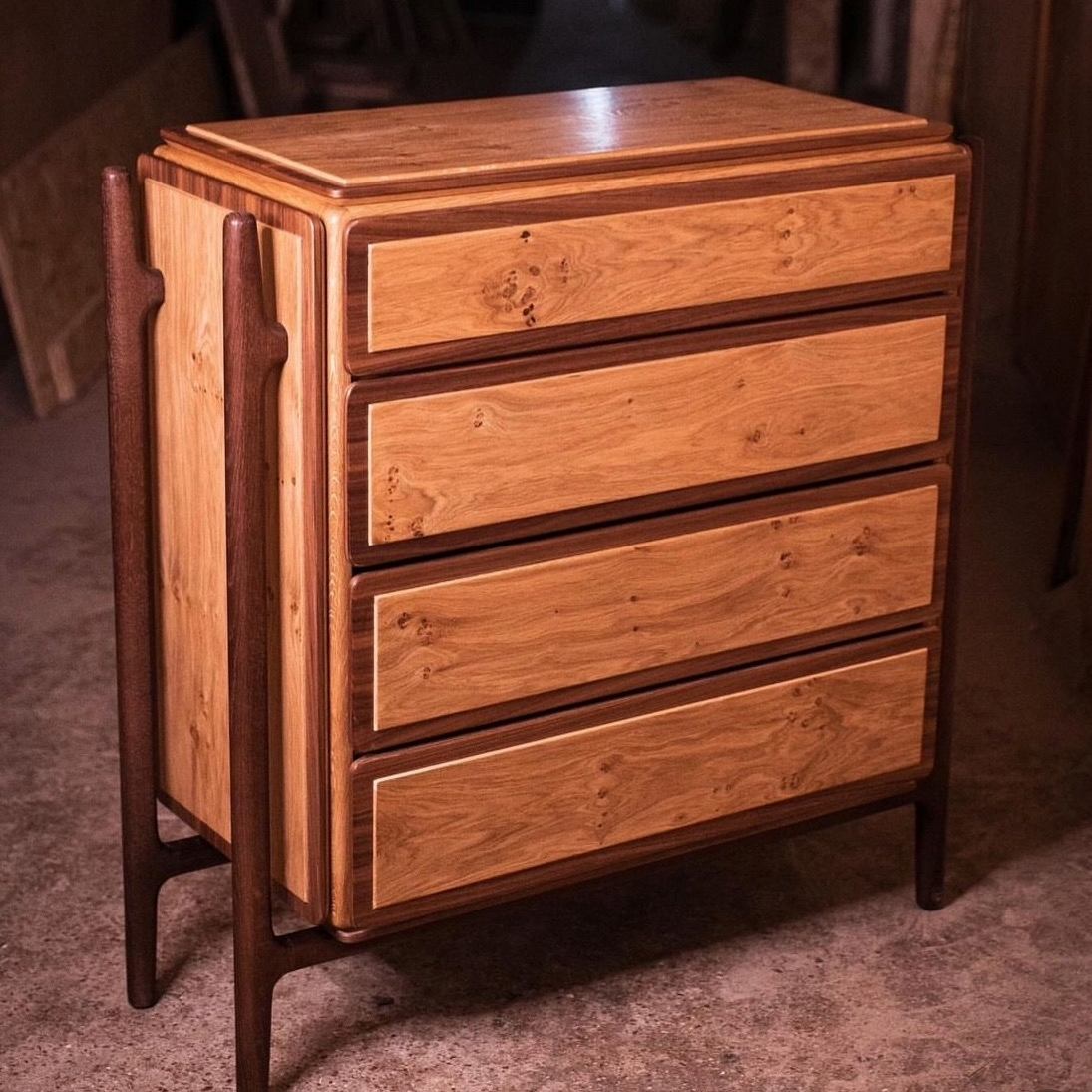 В разных ситуациях нравится работать с разной древесиной, но выделю дуб и абрикос. Думаю, нет столяра, которому бы не нравился дуб. Даже с технической точки зрения: приятный запах, от него мало заноз, а ещё эти занозы легко вытаскивать. Древесина абрикоса очень красивая, когда её заливаешь эпоксидной смолой. Я считаю себя скромным относительно мастеров, но думаю, что наш цех — один из лучших в России, кто делает изделия с эпоксидной смолой.