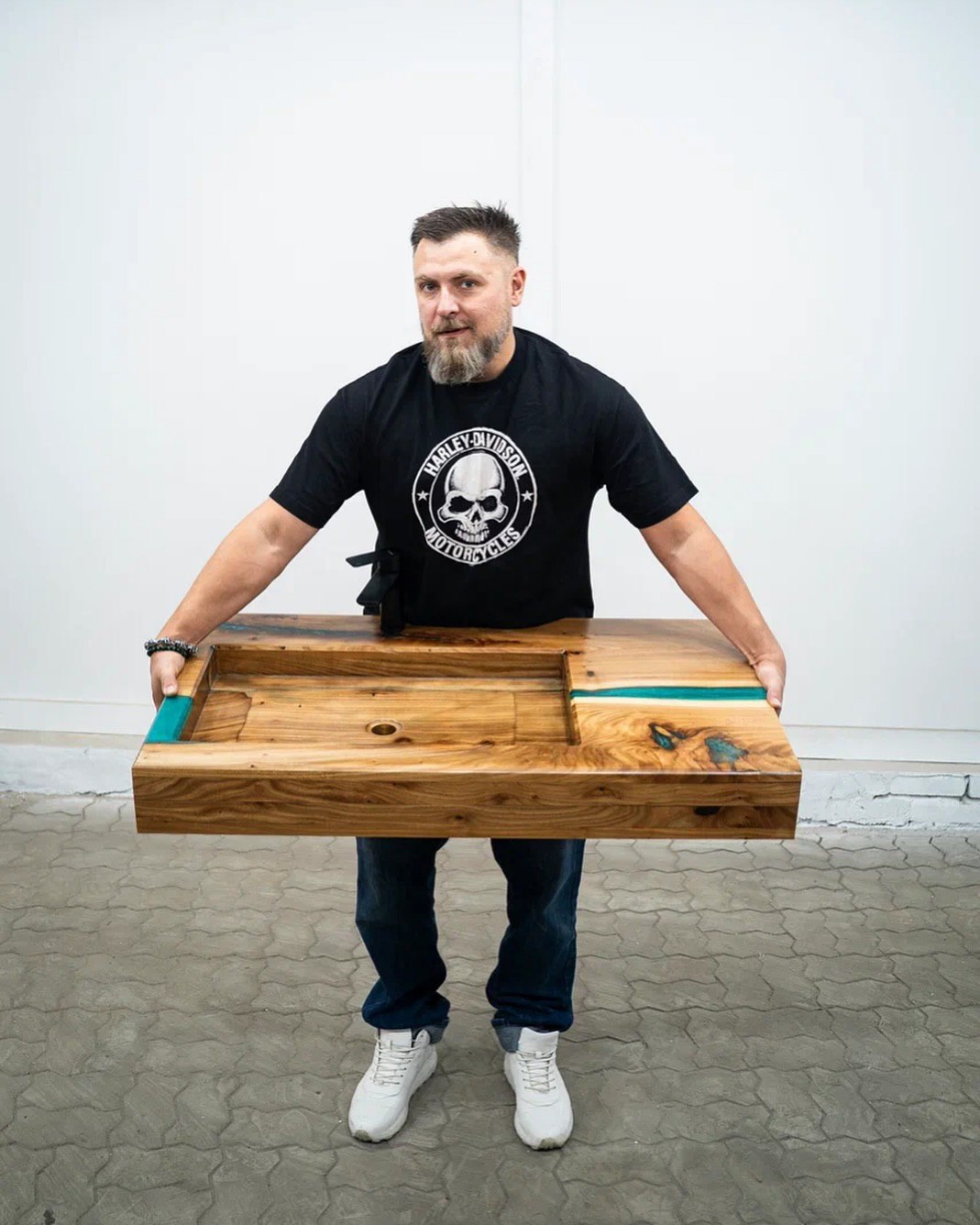 К дереву основатель проекта пришёл после 30 лет, хотя его отец — опытный столяр. Однажды Владимир решил попробовать сделать стол с эпоксидной смолой. Процесс увлёк мастера, и со временем тот решил превратить это хобби в полноценный бизнес. Мы поговорили с основателем «Кремены» о том, как менялся его проект и почему после 2025 года здесь сделали акцент на создании раковин.